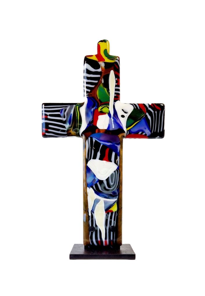 Ett färgsprakande konstverk som förenar glasfusingens tekniska precision med en stark visuell närvaro. Korsets traditionella betydelse och form utmanas genom en kraftfull användning av färger och mönster. Djärva, abstrakta färgblock bryter fram över ytan i en dynamisk rörelse som samverkar med svarta och vita ränder. Verket står upprätt, fastbultat på en stabil bas – en fysisk manifestation av balans och tyngd. Samtidigt vibrerar ytan av rörelse – färgerna bryter sig fria, ränderna böljar, och formen trotsar sin statiska natur. Det är en spänning mellan det orubbliga och det föränderliga, mellan det jordbundna och det andliga.